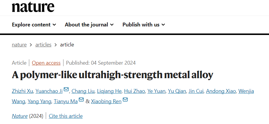 图1. 类聚合物的超高强度DS-STG合金与典型的金属合金材料和有机材料进行比较。© 2024 Springer Nature