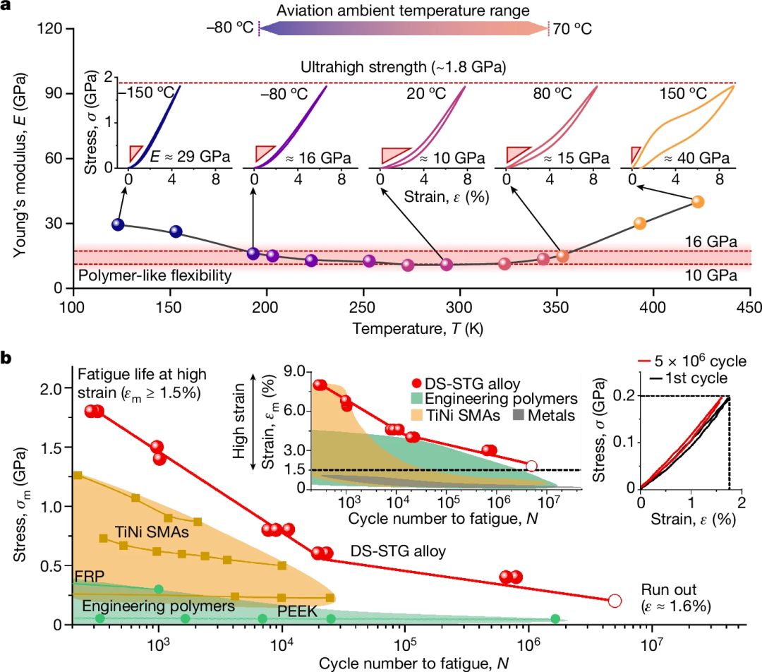 图2. DS-STG合金在很宽的温度范围内表现出类聚合物的超高强度和耐高应变疲劳性能。© 2024 Springer Nature