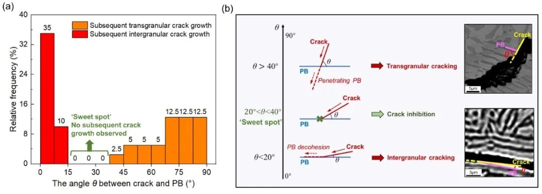 研究还发现裂纹/相界攻角对相界开裂行为具有显着影响。沿全裂纹路径对裂纹/相界攻角进行了40次测量,发现当裂纹/相界攻角过小时,容易引发相界脱粘进而造成沿晶开裂;当裂纹/相界攻角过大时,裂纹不得不突破相界进而造成穿晶开裂;当裂纹/相界攻角处于中间某个最佳角度窗口时,能够对高温疲劳裂纹在相界处的扩展起到一定抑制作用。研究还展望了相关结果对抗疲劳设计的意义,以期为相界相关的抗疲劳设计贡献新的思考。(请点击阅读全文了解更多信息)