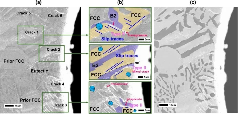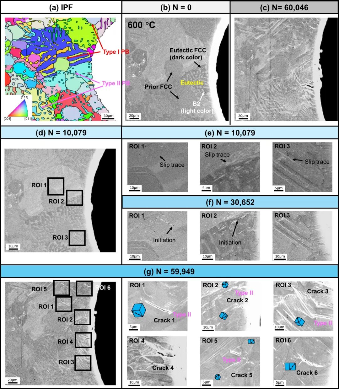 在高温结构材料领域,高熵合金因其在强塑性调控上展现出的潜力而受到关注。然而,相界作为潜在的薄弱点,可能会引发高熵合金疲劳开裂。近期,伯明翰大学、南京航空航天大学以及牛津大学的研究团队合作探究了高熵合金相界亚种相关的高温疲劳开裂机理,研究成果以“FCC/B2 phase boundary variant-sensitive fatigue cracking in a eutectic high entropy alloy at high temperature"为题,在国际学术期刊《International Journal of Plasticity》上得到了详细报道。牛津大学公派博后、伯明翰大学访问学者韩琦男博士为论文第一作者,合作导师为牛津大学/伯明翰大学双聘教授、工程院院士Roger C. Reed,韩琦男博士、伯明翰大学Yuanbo T. Tang教授和南京航空航天大学崔海涛教授为本文共同通讯作者。