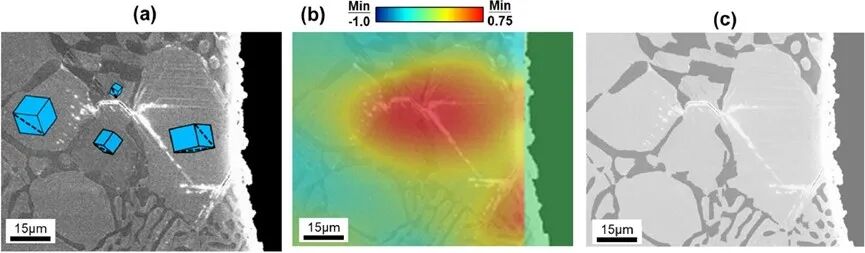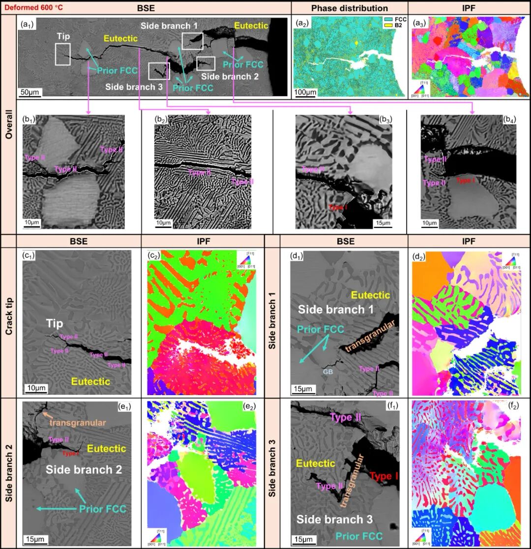 本研究围绕共晶高熵合金础濒颁辞颁谤贵别狈颈2.1,探究了高温下贵颁颁/叠2相界亚种和裂纹/相界攻角在疲劳开裂中的作用机理。通过高温原位扫描电子显微镜(厂贰惭)测试、电子背散射衍射(贰叠厂顿)和纳米压痕测量,揭示了贵颁颁/叠2相界的两种亚种在疲劳裂纹扩展中的不同行为,并量化了裂纹行为与裂纹/相界攻角的关联。此外,借助晶体塑性有限元分析了双相变形分配、位错密度演化及循环硬化行为。