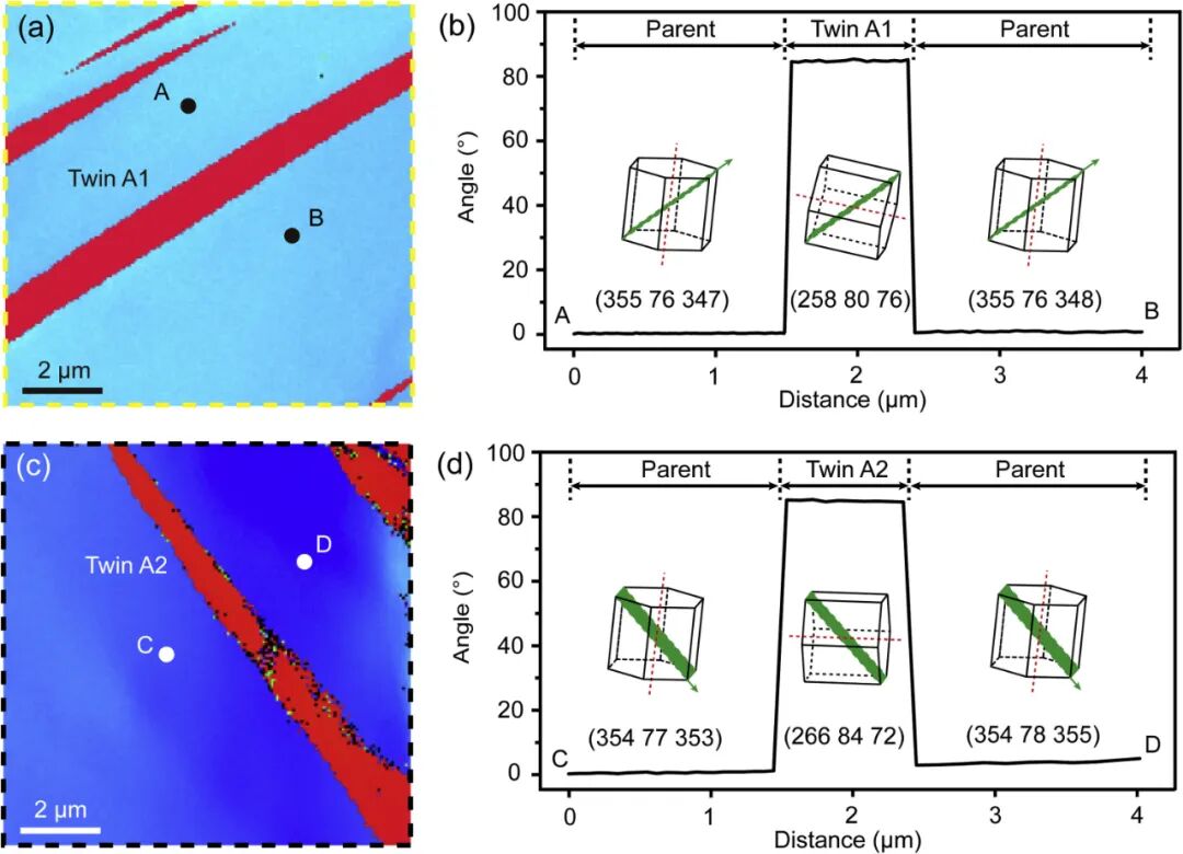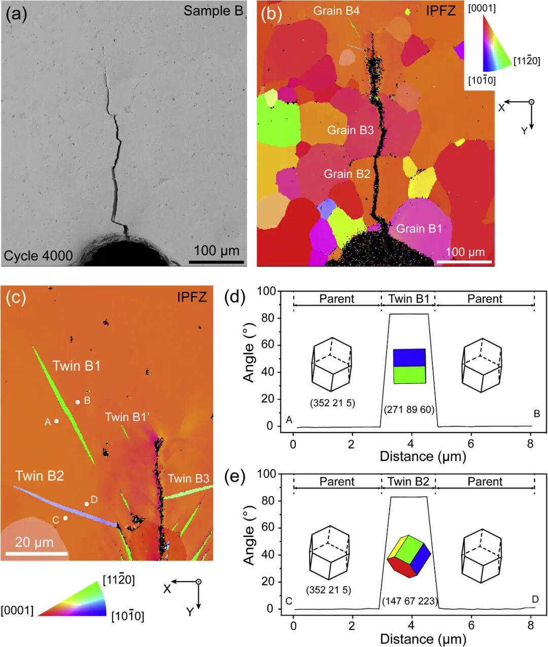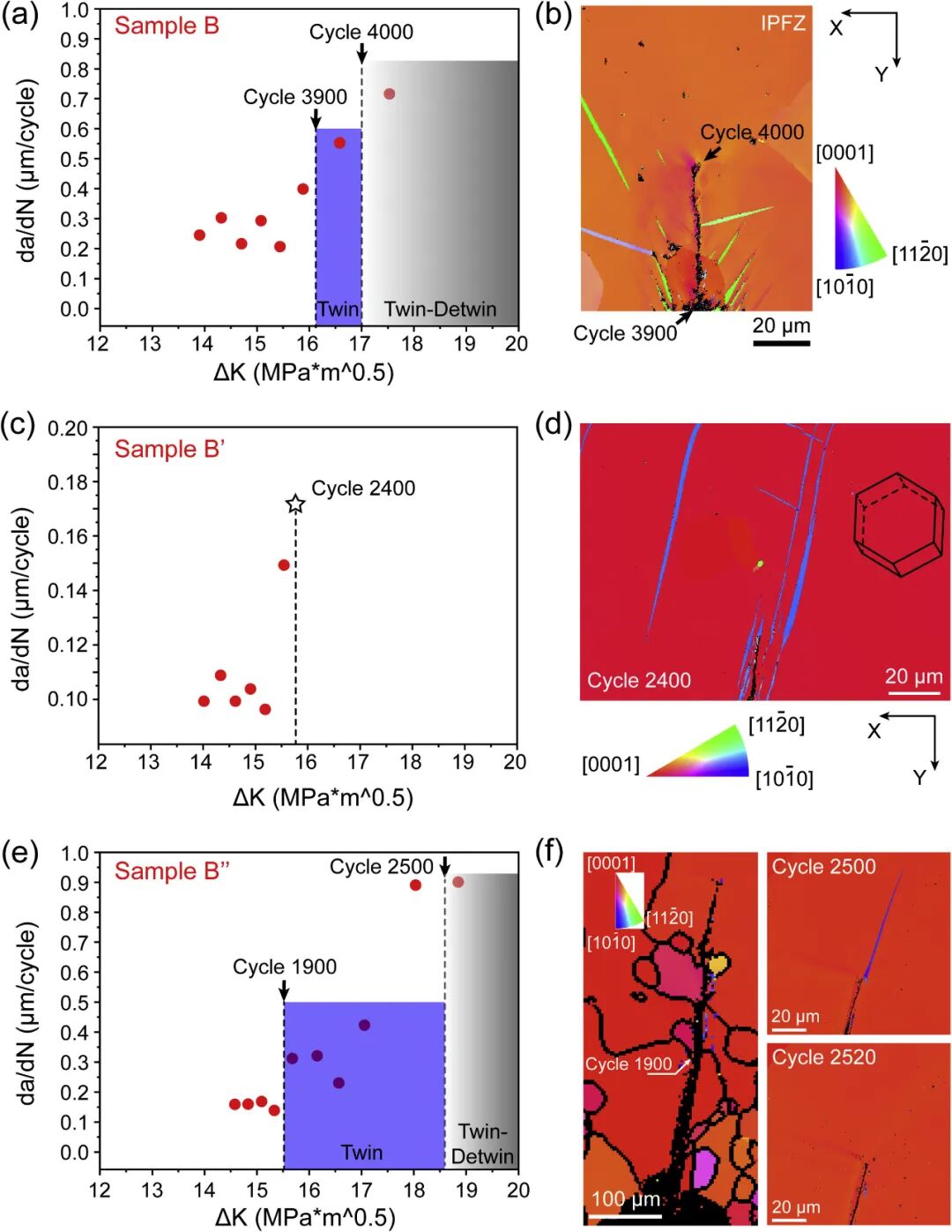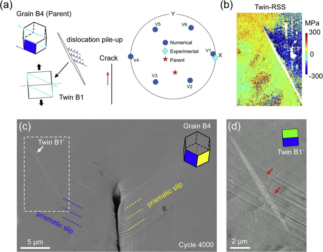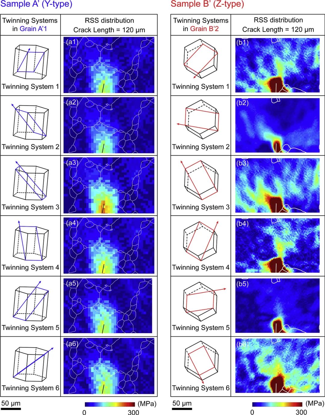 Y型与Z型样品裂纹孪生RSS空间分布对比,Z型样品(Grain B'2)所有孪生变体的RSS值更高(>300 MPa区域更广),晶体学取向差异直接解释Z型样品更易孪生。